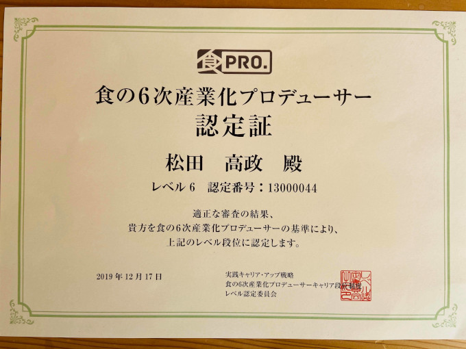 2019年、国家戦略プロフェッショナル検定「食の6次産業化プロデューサー(食Pro)レベル6」認定。